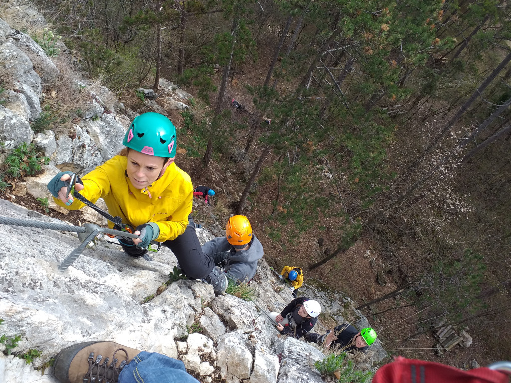 Kletterhelm, Klettersteigset, Hüftgurt, Klettersteighandschuhe (dünne Lederhandschuhe), feste Schuhe mit Profilsohle, Tagesrucksack, Trinkflasche, bequeme Sportkleidung, Regenjacke